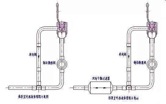 圖示翅片盤管作冷凝器使用時,冷凝液體直接通過單向閥,不通過圖中毛細管;作蒸發(fā)器用時,制冷劑經(jīng)過主毛細管一次節(jié)流后,再由分流毛細管分流。