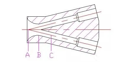 文丘里管型分流頭結(jié)構(gòu)十分簡單,只有本體,不帶其它零部件,但加工困難。從熱力膨脹閥出口的制冷劑兩相混合物,由分流頭進口A流經(jīng)收縮口B時,雖流速較高,壓力降較大,但流線平順,不與管壁脫離,使氣液兩相流體均勻地進入圓環(huán)形流道C中,由于管內(nèi)收縮與擴張段采用平滑過渡,制冷劑在整個流動過程中不產(chǎn)生紊流,所以文丘里管型分流頭阻力較小,對安裝位置無特殊要求。