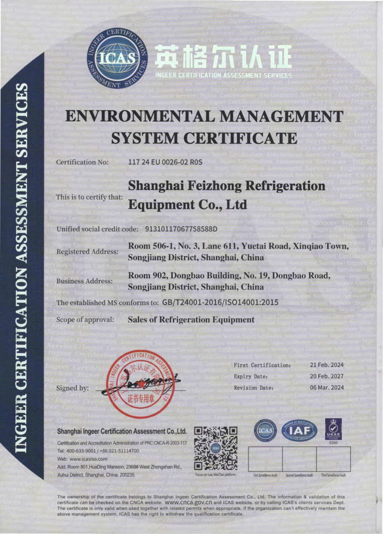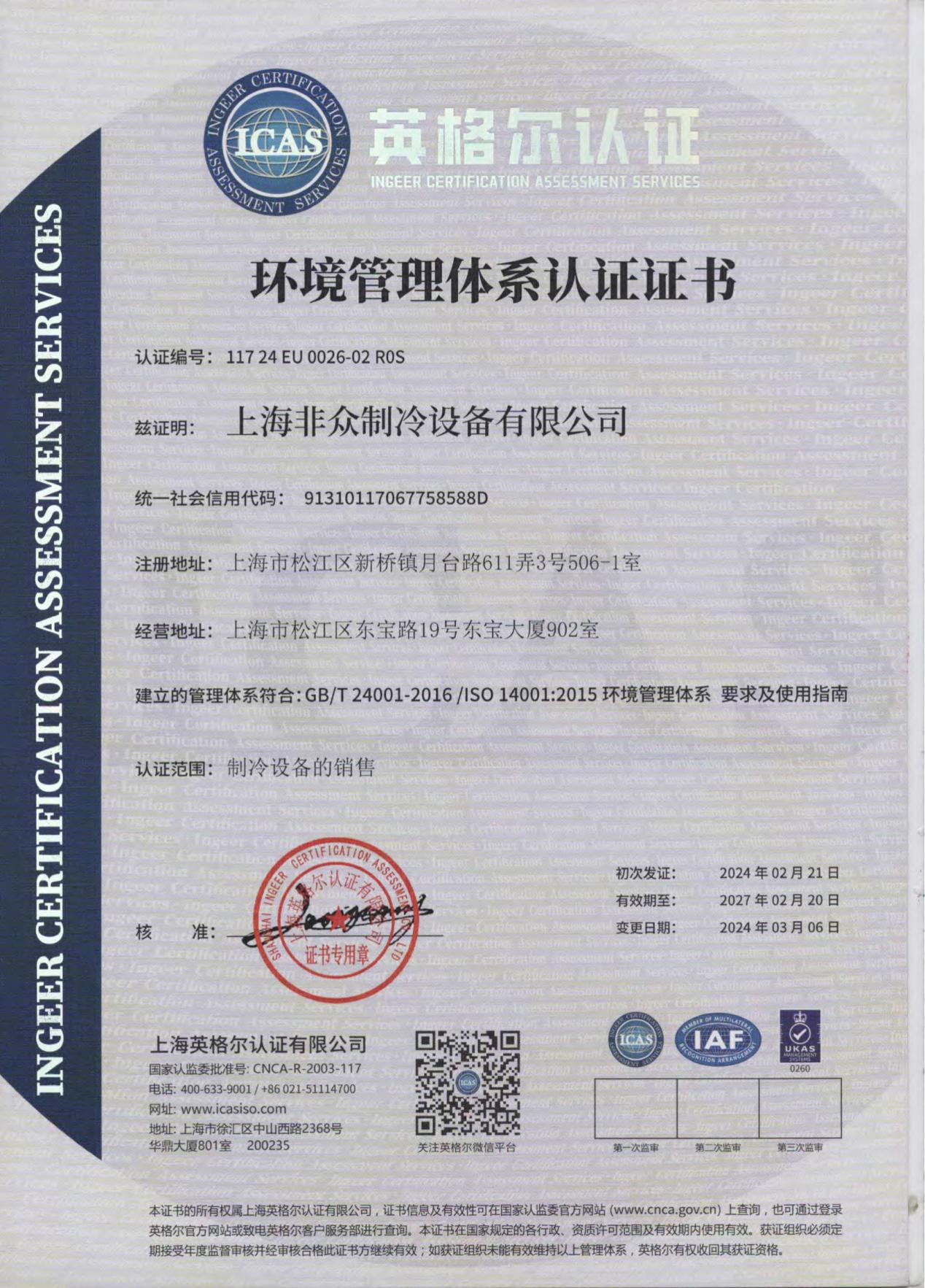 近日,上海非眾制冷設(shè)備有限公司傳來(lái)喜訊,公司成功通過(guò)了由上海英格爾認(rèn)證有限公司進(jìn)行的環(huán)境管理體系認(rèn)證和職業(yè)健康安全管理體系認(rèn)證,這標(biāo)志著非眾制冷在企業(yè)管理與可持續(xù)發(fā)展道路上邁出了堅(jiān)實(shí)的一步。兩項(xiàng)認(rèn)證編號(hào)分別為11724 EU 0026-02 ROS和11724 SU 0019-02 ROS,它們不僅是非眾制冷公司實(shí)力的有力證明,更是對(duì)公司長(zhǎng)期以來(lái)堅(jiān)持綠色發(fā)展、注重員工健康的肯定。
