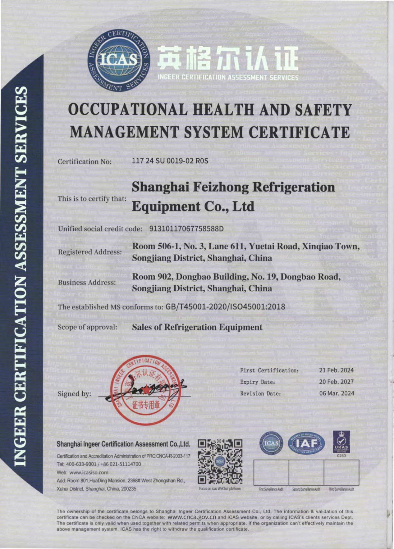 職業(yè)健康安全管理體系認(rèn)證則是對(duì)企業(yè)關(guān)注員工健康、保障員工權(quán)益的有力證明。上海非眾制冷設(shè)備有限公司始終將員工的生命安全和身體健康放在一位,通過(guò)建立完善的安全管理制度和應(yīng)急預(yù)案,確保員工在工作中能夠享受到安全、健康的環(huán)境。公司定期開(kāi)展安全培訓(xùn)和演練,提高員工的安全意識(shí)和自救互救能力,有效預(yù)防和減少了職業(yè)傷害事故的發(fā)生。