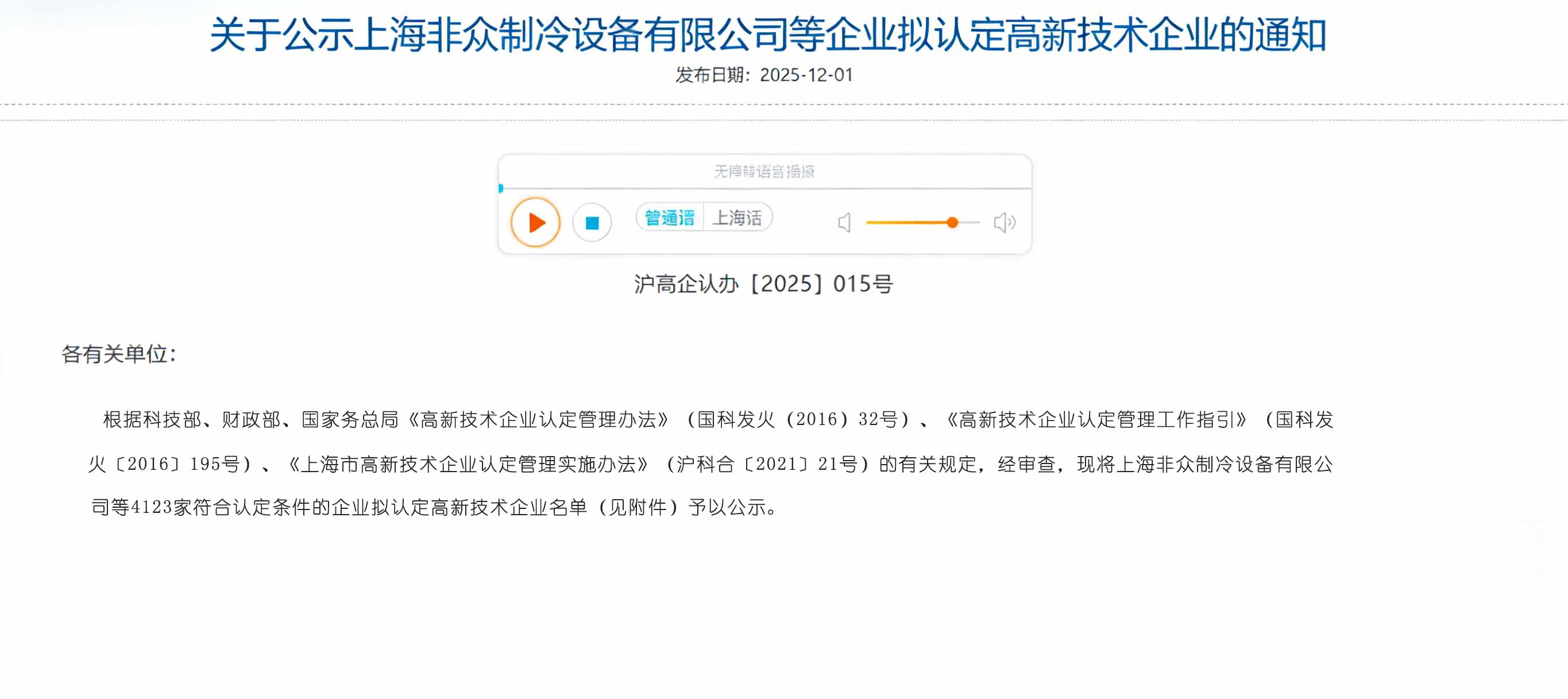 近日,根據科技部、財政部、國家稅務總局《高新技術企業認定管理辦法》(國科發火〔201632號)、《高新技術企業認定管理工作指引》(國科發火〔2016195號)、《上海市高新技術企業認定管理實施辦法》(滬科合〔202121號)的有關規定,經審查,現將上海非眾制冷設備有限公司等4123家符合認定條件的企業擬認定高新技術企業名單(見附件)予以公示。